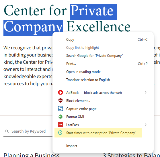 Additionally, the browser extension enables a context menu that allows you to start a new time entry using any selected text as the description: